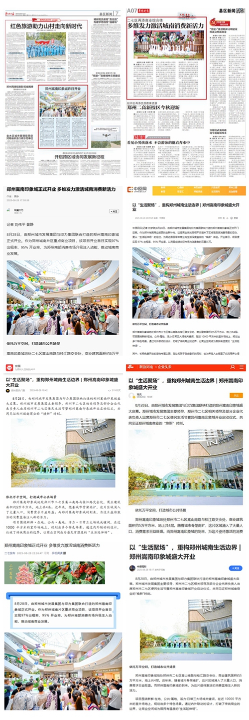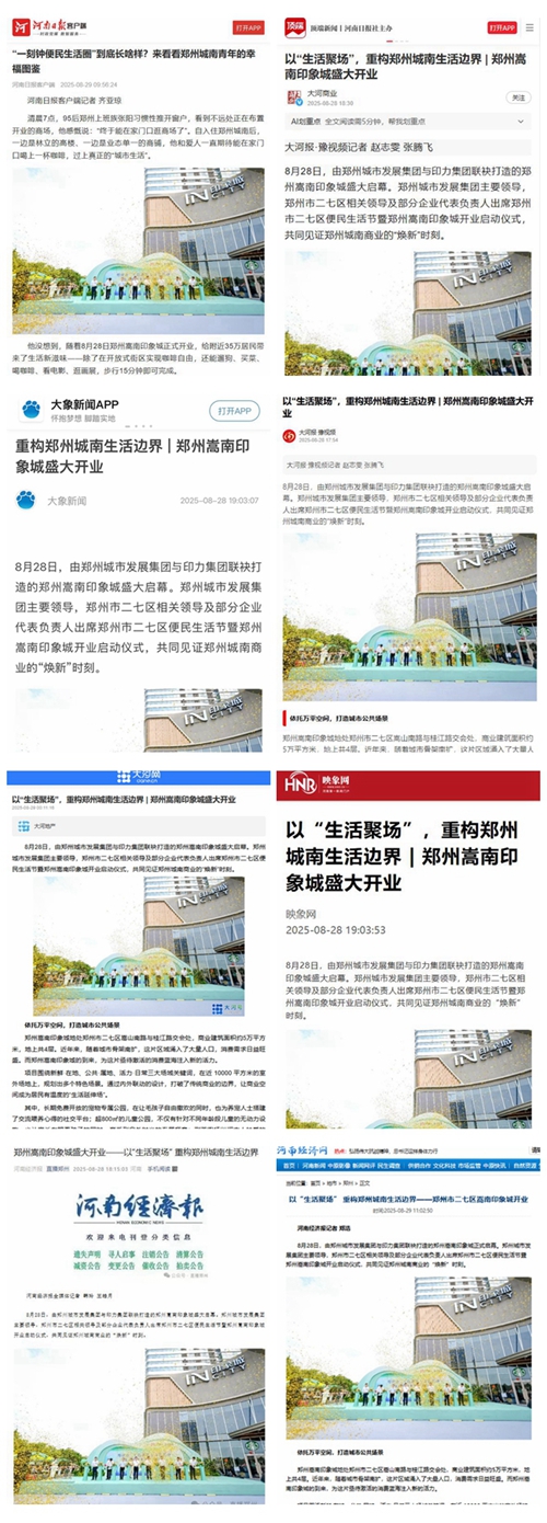 8月28日,鄭州城南商業(yè)格局迎來(lái)重大變革,由鄭州城市發(fā)展集團(tuán)與印力集團(tuán)攜手打造的鄭州嵩南印象城盛大啟幕,開業(yè)首日客流達(dá)12.6萬(wàn)人次,迅速成為全城矚目的焦點(diǎn)。這一盛事引發(fā)了各大媒體的廣泛關(guān)注,河南日?qǐng)?bào)客戶端、頂端新聞、大象新聞、大河報(bào)、大河網(wǎng)、映象網(wǎng)、河南經(jīng)濟(jì)報(bào)、鄭州日?qǐng)?bào)、鄭州晚報(bào)、鄭州廣播電視臺(tái)等媒體紛紛聚焦,對(duì)其開業(yè)進(jìn)行了全方位、多角度的報(bào)道。