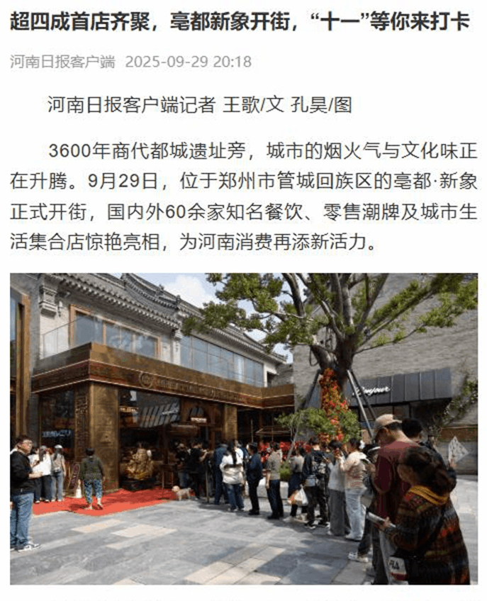 9月29日,備受矚目的城市更新標(biāo)桿項(xiàng)目——鄭州“亳都·新象”商業(yè)街區(qū)正式開街迎客。憑借著獨(dú)特的文化魅力與商業(yè)風(fēng)格,開街首日,街區(qū)人潮涌動(dòng),客流量突破10萬(wàn)人次,項(xiàng)目取得了1億+的線上累計(jì)曝光量。不僅銷售業(yè)績(jī)表現(xiàn)亮眼,取得了轟動(dòng)性的開門紅,也收到了業(yè)界專家發(fā)來(lái)的賀詞和眾多媒體的報(bào)道。