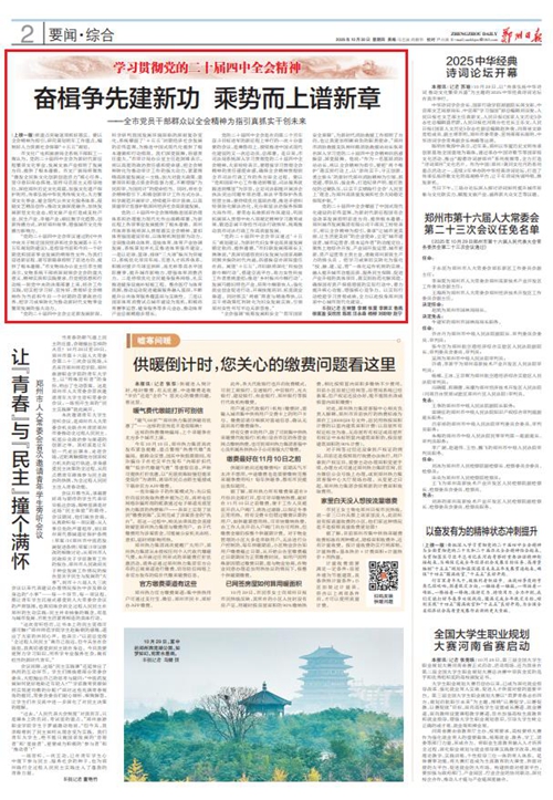 黨的二十屆四中全會擘畫了中國式現(xiàn)代化建設(shè)的宏偉藍(lán)圖,為新時(shí)代新征程國有企業(yè)改革發(fā)展指明前進(jìn)方向、提供根本遵循,鄭州城發(fā)集團(tuán)廣大黨員干部群眾深受鼓舞、倍感振奮。近日,《鄭州日報(bào)》《鄭州晚報(bào)》開設(shè)了【學(xué)習(xí)貫徹黨的二十屆四中全會精神】專欄,2025年10月30日,報(bào)道了鄭州城發(fā)集團(tuán)深入學(xué)習(xí)貫徹落實(shí)黨的二十屆四中全會精神,以全會精神為指引真抓實(shí)干創(chuàng)未來。